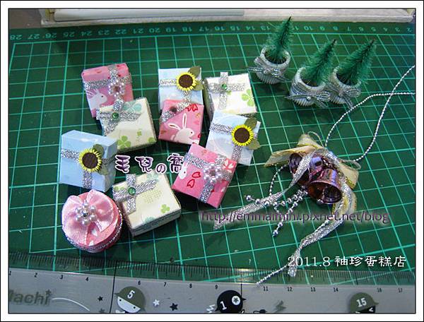 共選了3種花色的紙張製做,配上緞帶以及其它手工藝素材,