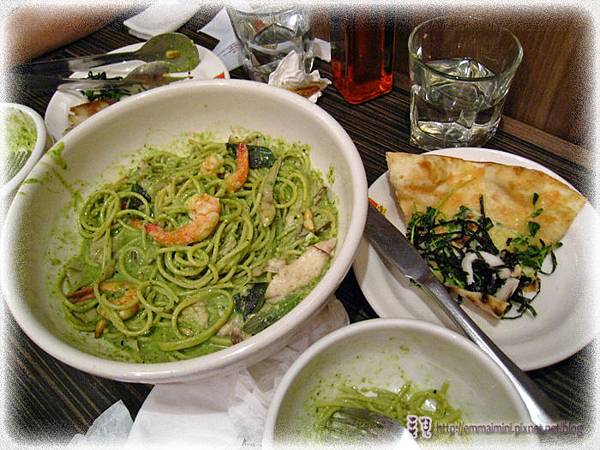 所以只點了蘿勒汁鮮蝦磨菇麵和和風明太子中卷鮪魚比薩,